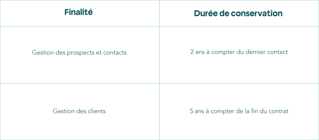 Pour plus de clarté nous avons repris ci-après pour chacune des finalités les durées de conservation :